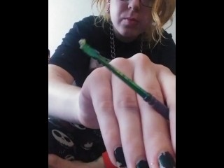 Stoner slut smokes+ cums on her toys
