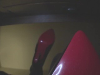 Brunette takes off her heels and shows her bare feet