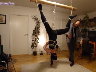 Shibari play session with suspension in butterfly harness and spanking