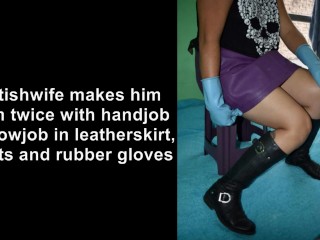 Fetishwife makes him Cum Twice with Handjob blowjob in Rubber Gloves &Boots