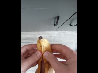 Guy solo fucks banana and cums on the floor