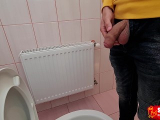 Uncircumcised cock pees on the station toilet
