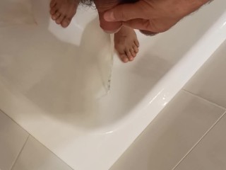 Pissing in the bathrom. Писсинг в ванной. Писаю на свои ножки и немного массирую член.