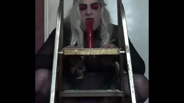 sissy crossdresser rides his dildo cock while heavy weight pulls on his ballsack