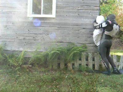 In a fantasy scene a frogman humps a dummy villain in the forest