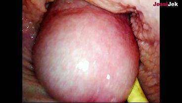 The camera inside the deep pussy records a huge ejaculation with a stuck condom