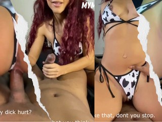 THREESOME MMF skinny girl have fun with two dicks at once.1st boy cums on TITS, 2nd boy cums on FEET