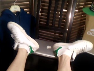 Apple laptop worships Adidas Stan Smith sneakers, white socks, boy's feet fetish, twink's legs