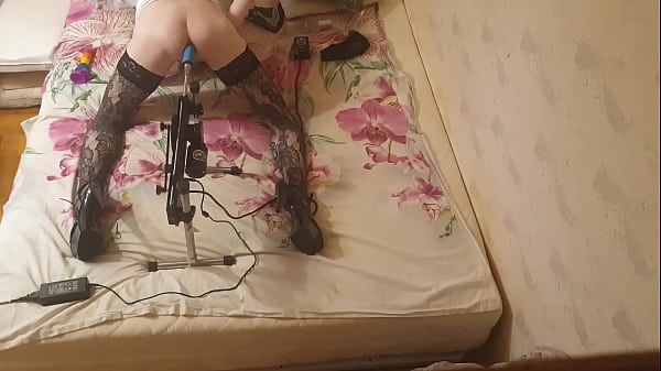 Sissy with fucking machine on the bed