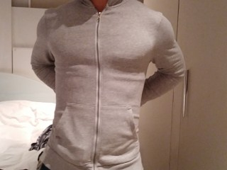 stripping and flexing through my hoodie, tanktop, briefs flexing my muscles