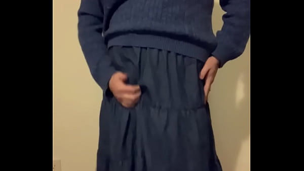 Man in Tight Womens Sweater with Huge Tits and Blue Skirt Strips to Bra and Panties then Jerks off