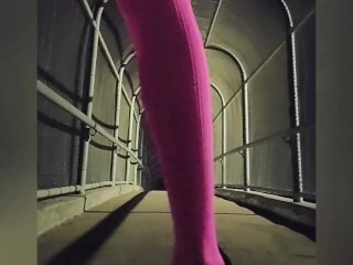 Shy sissy flashing on public bridge and around city