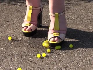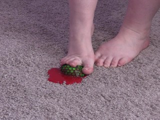 Crushing marshmallows with high heels. Chubby MILF with big feet in high heel shoes.