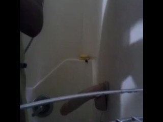 Slim crossdresser takes 13 inch long dildo wearing stockings in bathroom