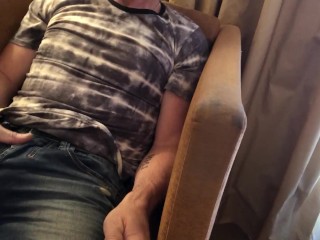 Pulling out bulging cock from jeans and stroking