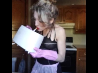 Hot young housewife chores-rubber gloves smoking lingerie STRIPS n kitchen!